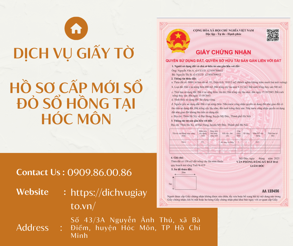 Dịch vụ giấy tờ nhà đất tại Hóc Môn tư vấn hồ sơ cấp mới sổ hồng theo luật đất đai 2024 tại Hóc Môn, dịch vụ uy tín, chuyên nghiệp – Liên hệ 0909.86.00.86, địa chỉ số 43/3A Nguyễn Ảnh Thủ, xã Bà Điểm, huyện Hóc Môn, TP.HCM.
